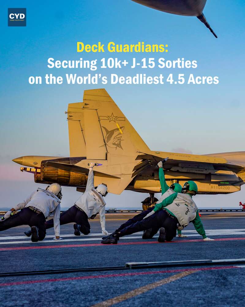 The Flight Deck Crews of China's Shandong Aircraft Carrier operate on the "world's most dangerous 4.5 acres". They safeguard J-15 'Flying Shark' fighter jets — the carrier's combat spearhead — having secured 10,000+ sorties with rising mission readiness rates. (Photo by Li Gang)