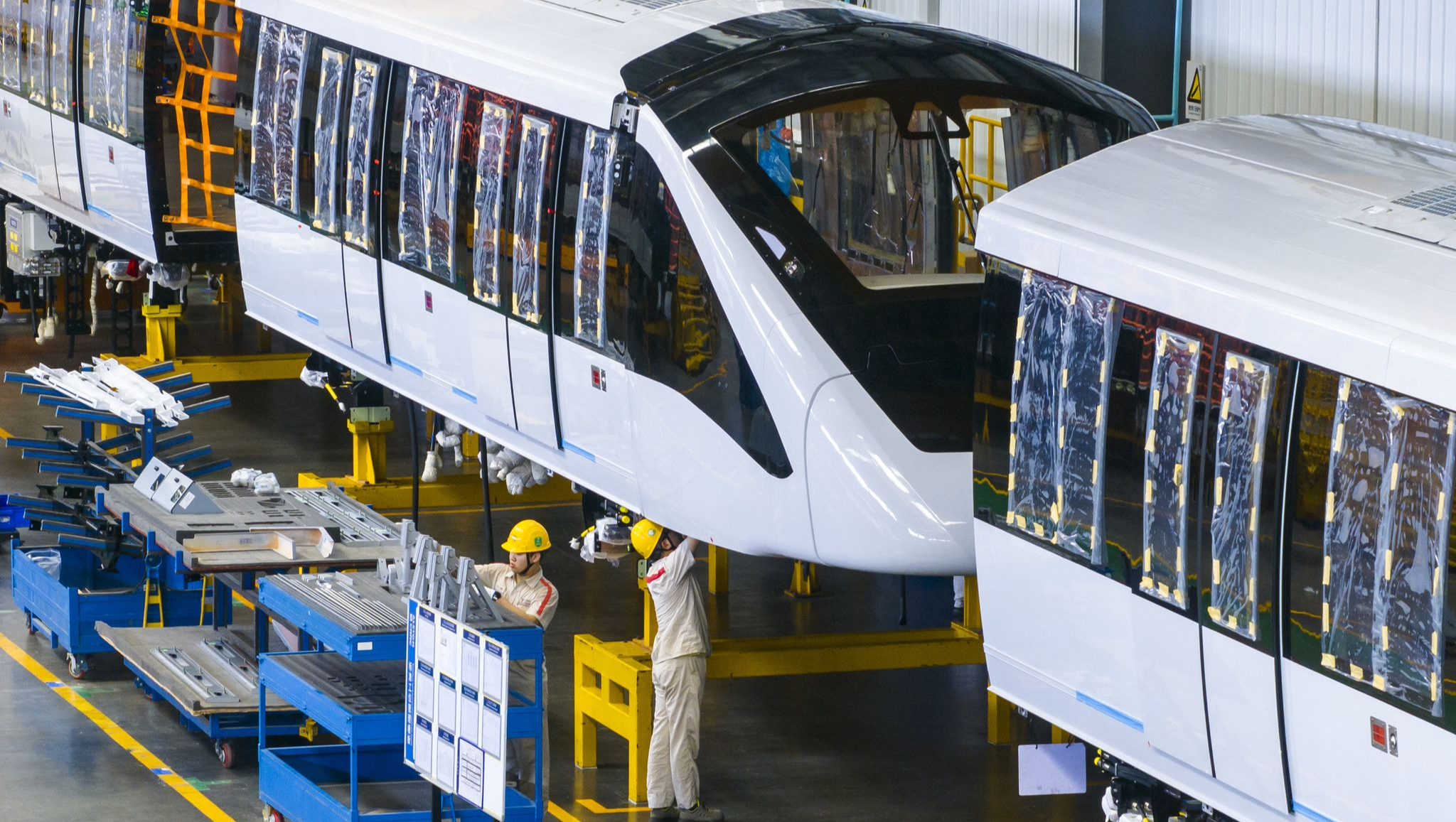 安徽芜湖:工人车间生产制造无人驾驶轨道列车