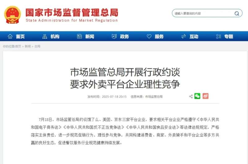 7月18日,市场监管总局约谈饿了么、美团、京东三家平台企业,要求相关平台企业严格遵守《中华人民共和国电子商务法》《中华人民共和国反不正当竞争法》《中华人民共和国食品安全法》等法律法规规定,严格落实主体责任,进一步规范促销行为,理性参与竞争,共同构建消费者、商家、外卖骑手和平台企业等多方共赢的良好生态,促进餐饮服务行业规范健康持续发展。