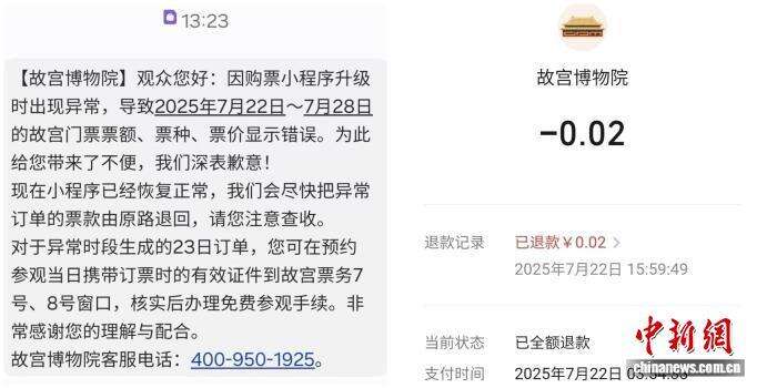记者看到,这条以故宫博物院名义发出的短信内容为:“观众您好:因购票小程序升级时出现异常,导致2025年7月22日至7月28日的故宫门票票额、票种、票价显示错误。为此给您带来了不便,我们深表歉意!现在小程序已经恢复正常,我们会尽快把异常订单的票款由原路退回,请您注意查收。由于故宫周一闭馆,您在异常时段生成的28日订单,可在7月27日或29日,携带订票时的有效证件到故宫票务7号、8号窗口,核实后办理免费参观手续。非常感谢您的理解与配合。故宫博物院客服电话:400-950-1925。”