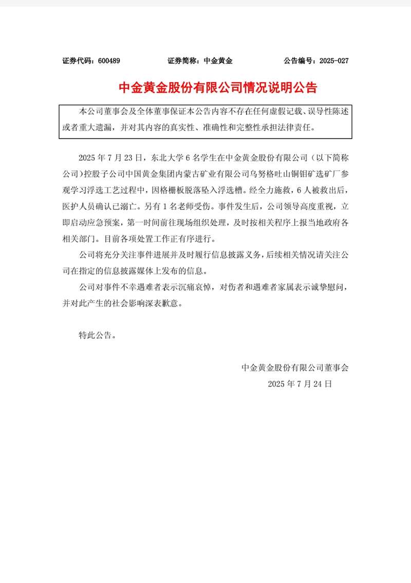 中国青年报客户端北京7月24日电(中青报·中青网见习记者 赵丽梅 记者 张均斌)今天,中金黄金发布情况说明公告,并向遇难学生致歉。公告指出,7月23日,东北大学6名学生在中金黄金股份有限公司控股子公司中国黄金集团内蒙古矿业有限公司乌努格吐山铜钼矿选矿厂参观学习浮选工艺过程中,因格栅板脱落坠入浮选槽。经全力施救,6人被救出后,医护人员确认已溺亡。另有1名老师受伤。