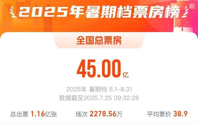 据网络平台,截至7月25日09时30分,2025年暑期档(6月—8月)总票房(含预售)突破45亿。