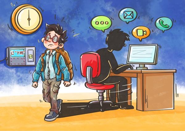 近日,北京二中院审理了一起因用人单位频繁在下班后安排线上会议和培训而引发的劳动争议案件,受到广泛关注。随着通信技术的发展,“隐形加班”现象日益普遍,而此类案件中劳动者面临举证难、加班时间和精力难以量化等困境。对此,亟需制定明确细则,例如规定用人单位在安排线上工作的同时必须有打卡记录,以切实保障劳动者权益。漫画:程璨