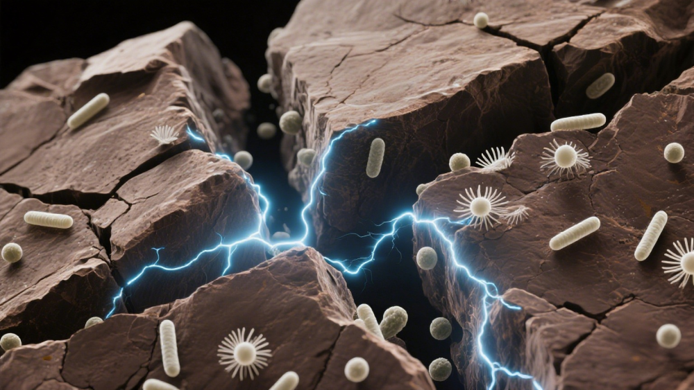 研究团队通过“压裂—反应”实验平台模拟地下数公里内的断裂活动。当岩石破裂产生新鲜表面时,断裂的化学键(自由基)瞬间与水相遇,生成可观的氢气和过氧化氢。项目负责人朱建喜研究员形容:“地震(剧烈的地壳断裂过程)等构造活动就像一台发电机,不断把机械能转换为化学能和电能。”氢自由基与过氧化氢耦合驱动了铁的氧化—还原循环,铁原子在两种状态之间反复“循环”,持续释放电子。这些电子进一步在碳、硫、氮等生命必需元素之间流动,形成看不见的“地下电网”,为微生物提供可直接取用的能量。
