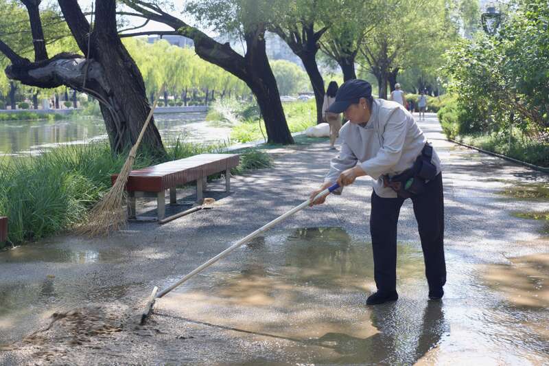 7月29日,北京,一名清洁员在清扫暴雨后路面上的大量积水、淤泥。李媛/摄