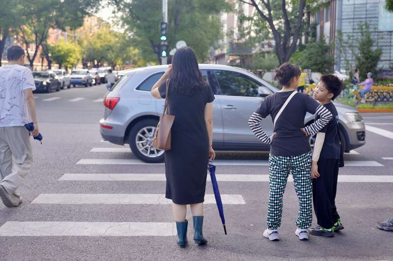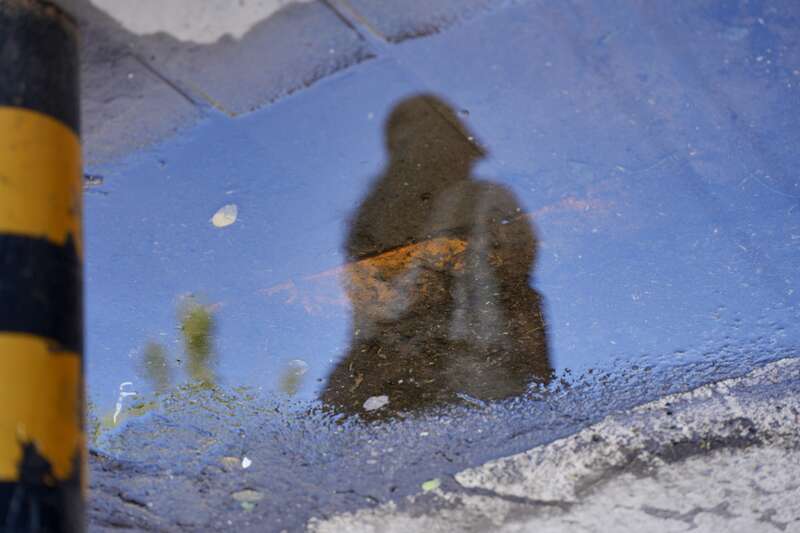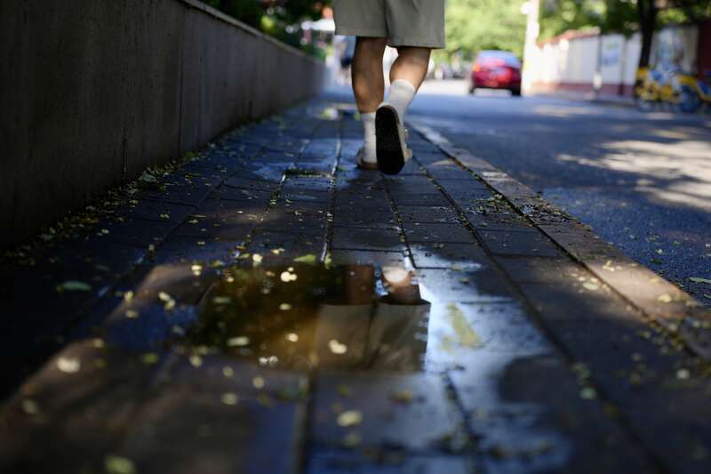 7月29日,北京,路面积水倒映下的行人背影。李媛/摄