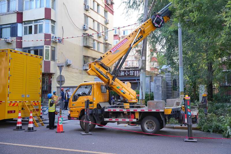 7月29日,北京,一台作业车正在修剪树枝。李媛/摄