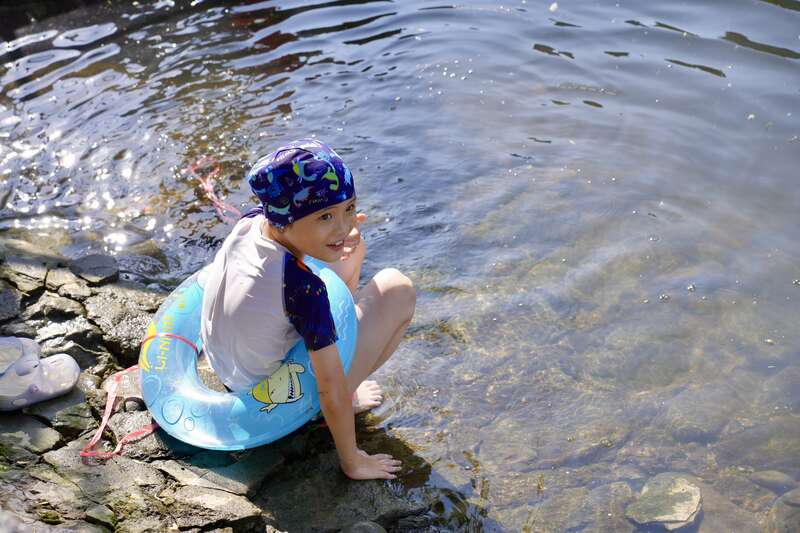 7月29日,北京,阳光照射下,一名小朋友在亮马河浅水区域嬉水。李媛/摄