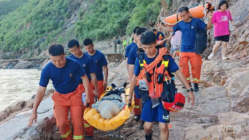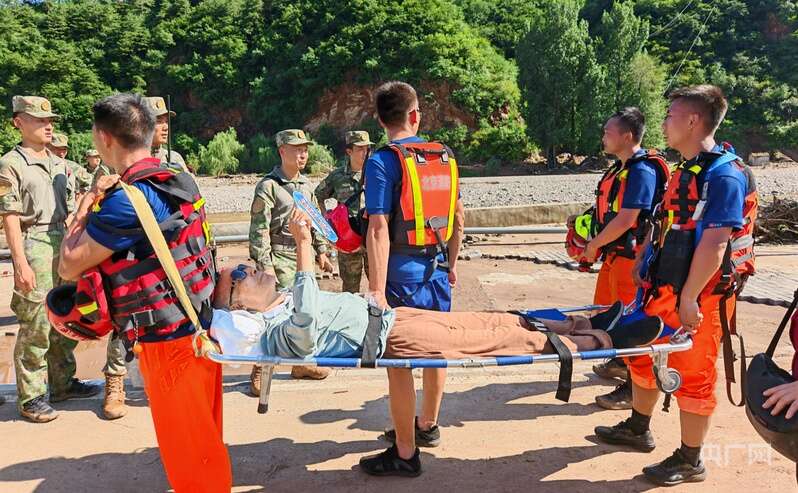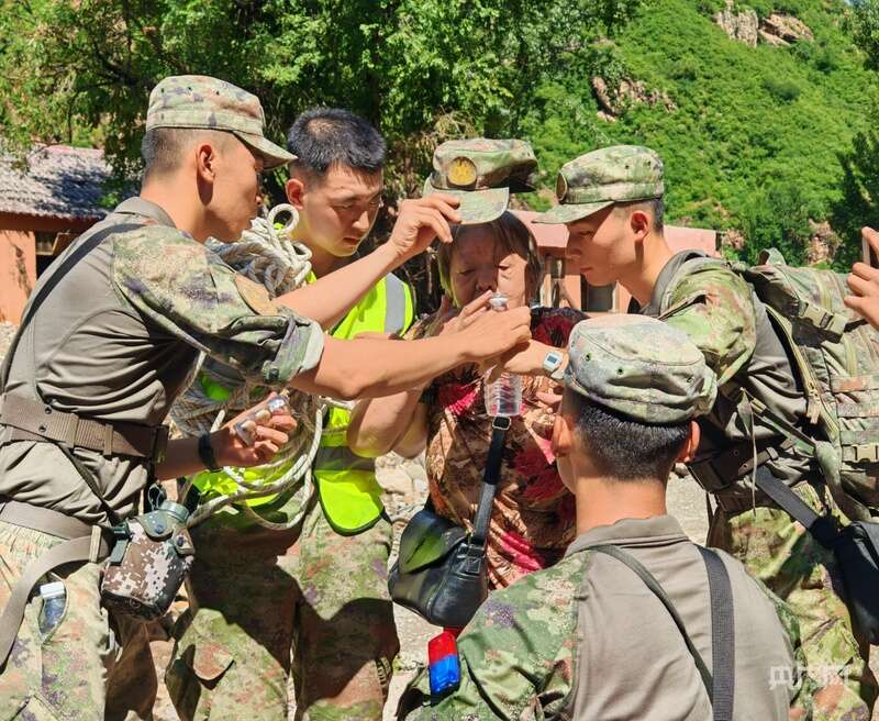 其中,一位患病老人在暴雨中不慎摔倒,导致手腕、脚腕骨折,无法独立行走,在几位村民的搀扶下才慢慢挪过来——她嘴唇泛白、嘴角止不住地颤抖,随身携带的包里装着治冠心病的药。见状,救援人员迅速支起担架,托着老人背部和腿部轻放上去,有人用帽子为老人扇风,有人俯身帮她拧开瓶盖,递上矿泉水说:“您慢些吞,我们稳稳把您送出去。”
