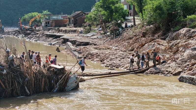 碾子湾村的村民正分批向村外转移,救援队伍在此暂停休整,同时协助村民跨过木桥。