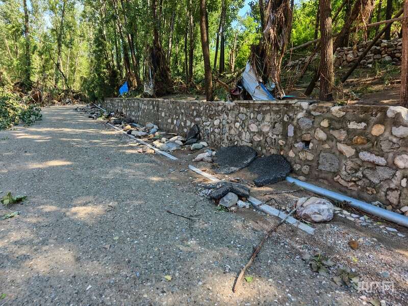 下午两点半,队伍继续行进,柏油路已被洪水“啃”得精光,裸露的地基间嵌着碎石。“前面7公里到村委会。”王起春指着路侧树林,声音发涩地说:“暴雨来临时,有游客的车辆被冲走,车里的人破窗逃出,抱着高处的大树苦苦支撑6个小时才脱离危险。”