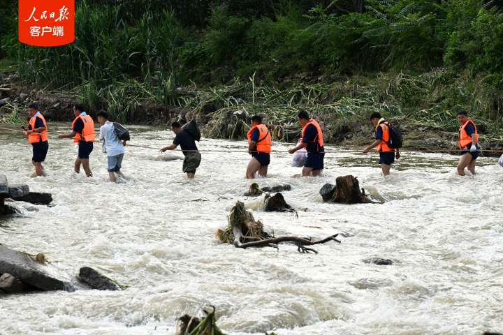 “伤员都已经运出来了,现在村里还有100多人,我们要回去把群众都接出来。”徐博强说完,又握着绳索下了河。
