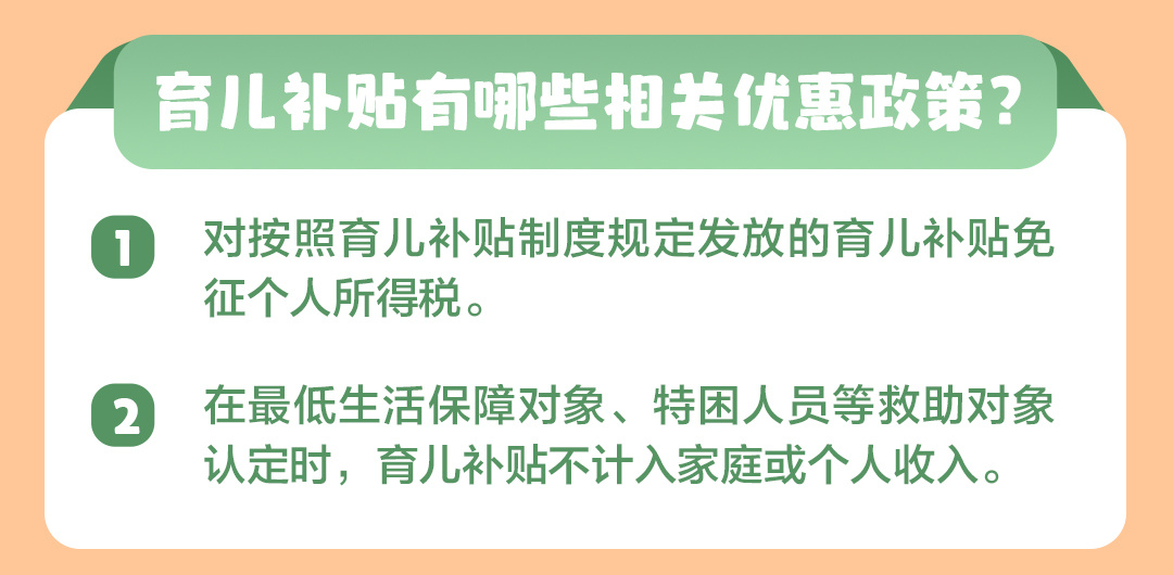 三是明确相关优惠政策。《实施方案》规定,对按照制度规定发放的育儿补贴免征个人所得税;在最低生活保障对象、特困人员等救助对象认定时,育儿补贴不计入家庭或个人收入。此前,国家出台了3岁以下婴幼儿照护个人所得税专项附加扣除政策,扣除标准为每孩每月2000元。这些政策配合育儿补贴制度,将综合发挥降低家庭生育养育成本的作用。目前,各级财政部门正在会同卫生健康部门紧锣密鼓开展补助资金的测算和下达工作。实施育儿补贴制度是党中央、国务院重大决策部署,承载了群众的期盼,财政部将配合卫生健康部门对资金申领发放各环节实行全过程监管,确保每一笔资金都安全抵达。