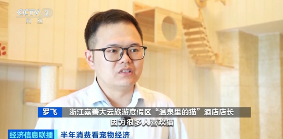 浙江嘉善大云旅游度假区“温泉里的猫”酒店店长 罗飞:引进这个项目之后,入住率比前两年增长了15%到20%,多数是冲着猫来的,因为很多人喜欢猫,但是没有时间养猫,我们酒店就提供这种场所。