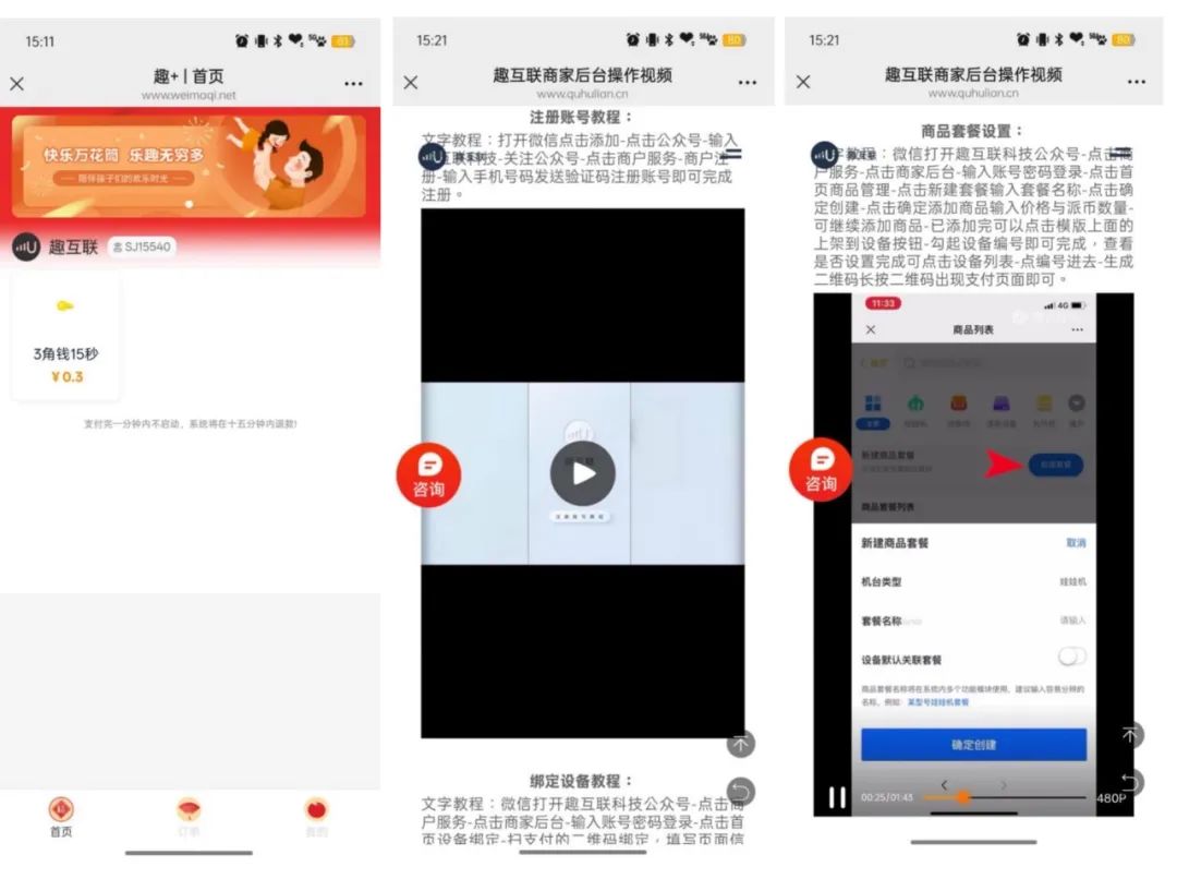 而扫码进入后,显示出一个名为“趣互联”的收费页面。收费标准为3角钱15秒。记者查询到,该平台上是物联网自助设备流量聚合平台,商户可以在此注册账号、绑定设备,再设定商品套餐和价格等,就可以实现对娃娃机和按摩仪等设备的远程操控。据收费软件客服人员透露,公司已为国内70多个景区的扫码用水项目提供平台服务。