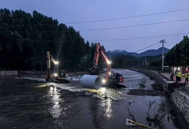 在位于密云北部山区的太师屯镇沙峪村,沙峪桥是当地村民进出村子的唯一通道,持续多日的极端强降雨造成安达木河洪水暴涨,导致桥梁冲毁。抢险队投入挖掘机、装载机、起重机等多台大中型设备,昼夜不停开展抢修作业。“抢险队从外地调入发电机、油罐车等保障装备,紧急购置用于铺设便桥的混凝土管,并在属地指引确认下就地取用砂石料、土方等物资材料投入抢险。”中铁六局沙峪村抢险现场负责人胡江南说。