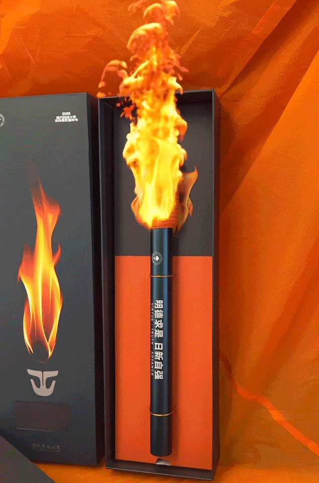 黑盒子下方的区域可以直接点燃,点燃后会出现,“明德求是,日新自强”的校训。盒子里是一枚火炬,用手机扫描,能呈现出熊熊燃烧的AR效果。