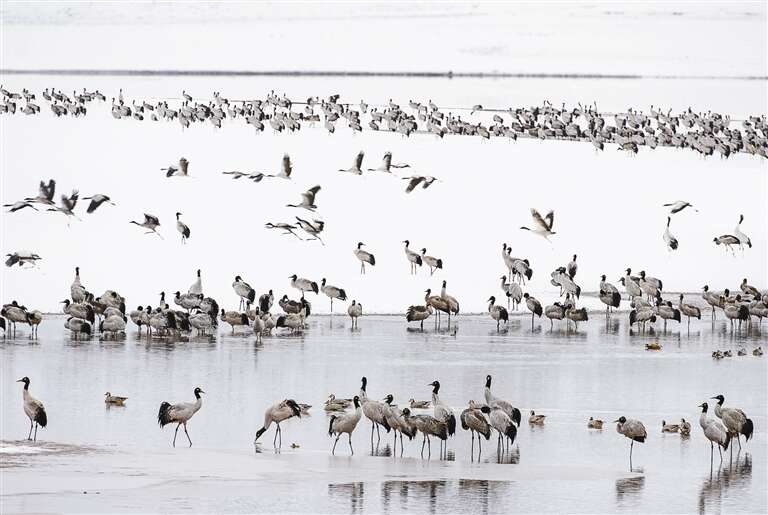 近年来,随着自驾游客的日益增多,生态保护也面临着新的课题。去年,申扎县专门组建了“雪之傲影”团队,打造一支专业生态保护尖兵,构建“空中无人机巡航+地面智能检测+队员徒步巡逻”的全方位防护网络。同时,每年重点时期开展“保护黑颈鹤家园”主题宣讲等,展示展出色林错国家级自然保护区内的珍稀野生动物影像资料,向游客宣传野生动物保护知识。