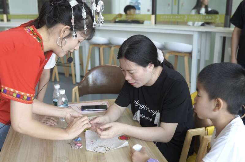 家长和孩子制作织锦冰箱贴。受访者供图