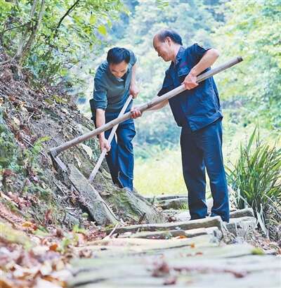 每次上山修路,陈兴海和弟弟陈兴合都会带上铁锹、镐头、锄头、斧头。“石头硬得很,我一镐头下去,手震得疼!”这样的日子,兄弟俩一过就是8年。总长约15公里的古道,已经修好了约2/3。“我们还要继续往下修。”陈兴海说。