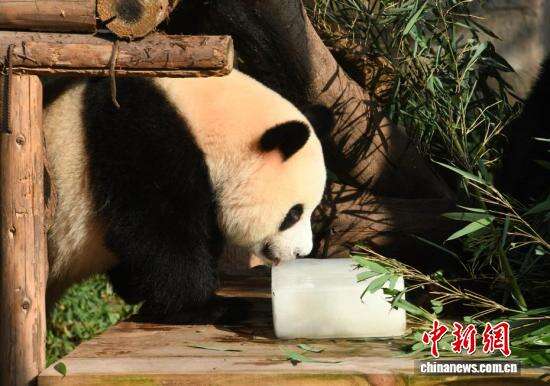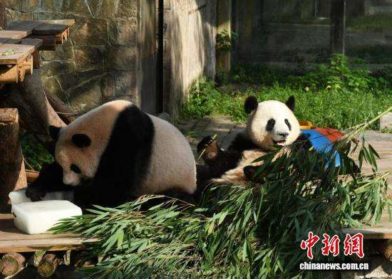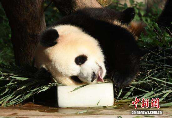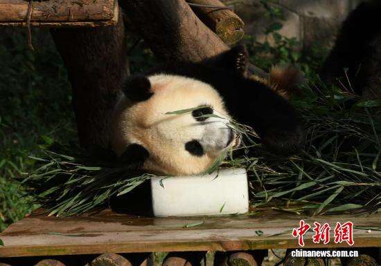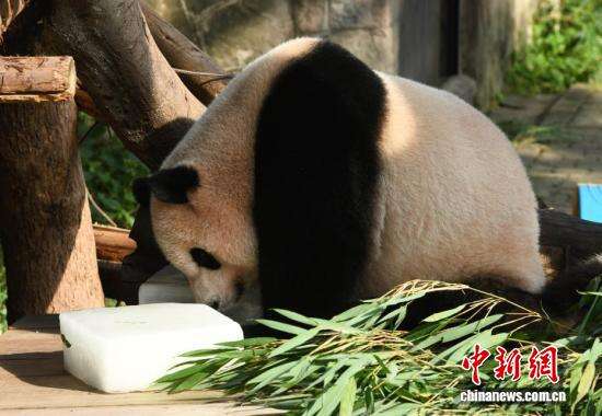 8月5日,重庆动物园大熊猫吃冰砖享受清凉。