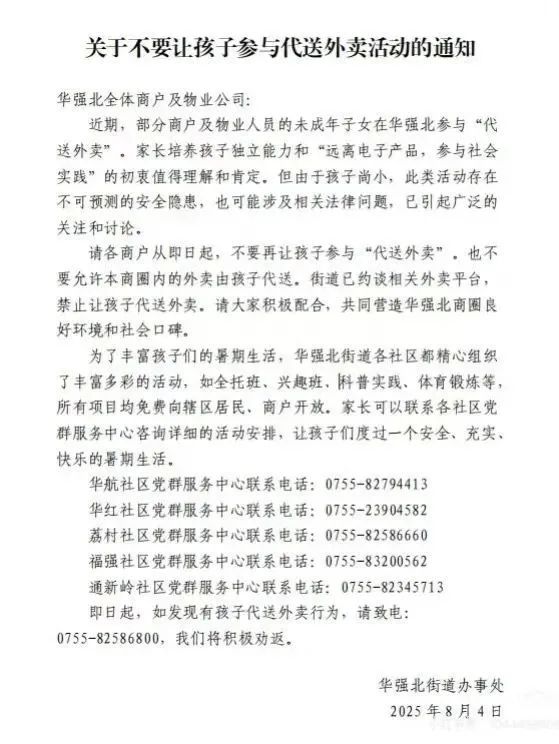 8月4日晚,网上流传着一份《关于不要让孩子参与代送外卖活动的通知》,落款为华强北街道办事处。