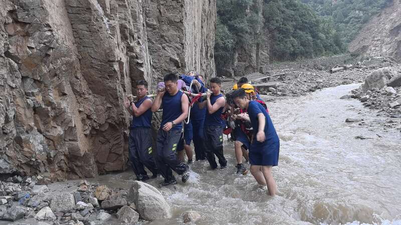 孙胡沟村的情况更为危急。一位需要透析的老人急需下山,超过两天不做透析将会有生命危险。怀柔消防支队消防员将老人固定在临时担架上,抬着老人走过乱石、经过急流、攀上2米高的崖壁。经过六小时的转运,老人和其老伴被转运到镇上,由120急救车接力转运。