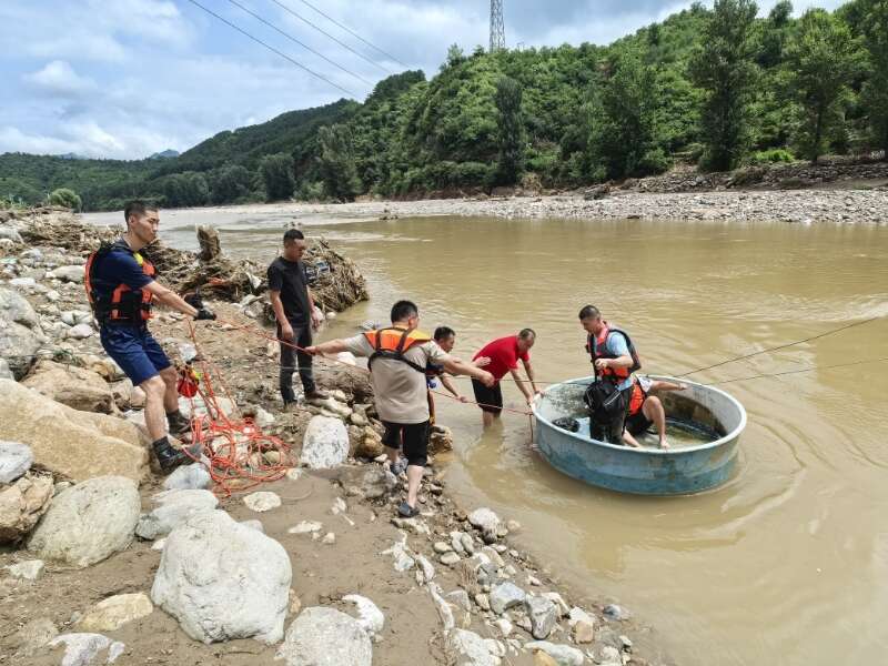 而在琉璃庙镇碾子湾村,90余名被困在河道“孤岛”上的村民及游客也急需救援。当时,包括海淀区采石路特勤站副站长李建飞在内,现场留守了5名消防员,他们用专业绳索倍力系统固定简易渡船——直径1.5米的塑料养鱼盆,在湍急河流中搭建转运通道。队员分批牵引船只,以接力的方式往返运送群众。鱼盆往返二十余趟,最终,80名村民及游客全部被安全转移出来。