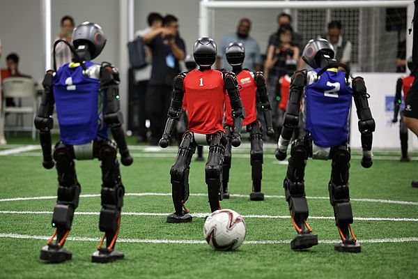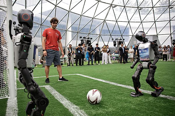 2025年8月4日,北京,2025世界人形机器人运动会举行媒体参观活动,“助推者”人形机器人进行了一场足球表演赛。2025世界人形机器人运动会将于8月14日至17日在北京举行。