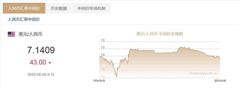 8月6日人民币对美元中间价报7.1409元 下调43个基点