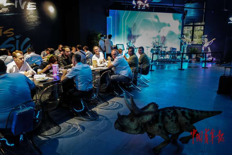 8月6日,北京经济技术开发区(北京亦庄)机器人产业园,智能机器人主题餐厅,恐龙机器人和用餐的客人互动。中青报·中青网记者 赵迪/摄