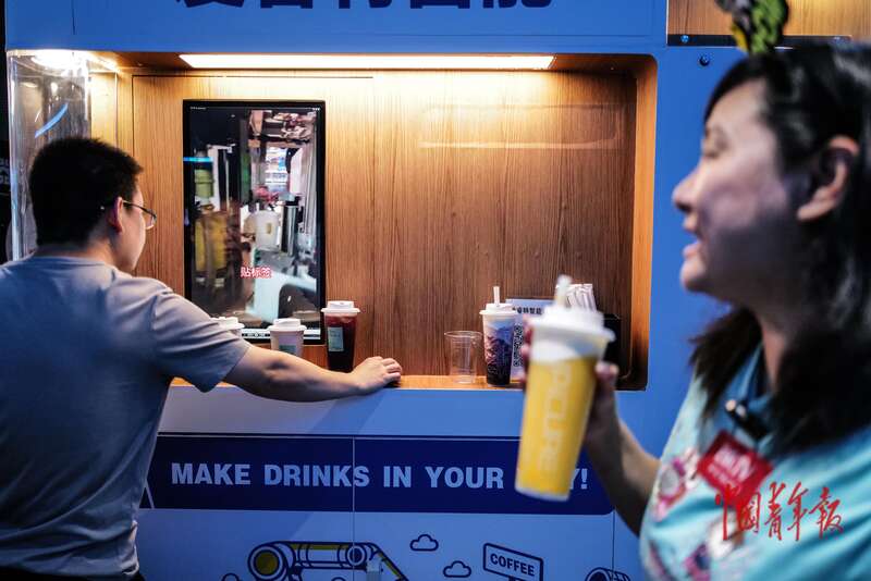 8月6日,北京经济技术开发区(北京亦庄)机器人产业园,智能机器人主题餐厅,一位女士在体验“奶茶机器人”制作的饮品。中青报·中青网记者 赵迪/摄
