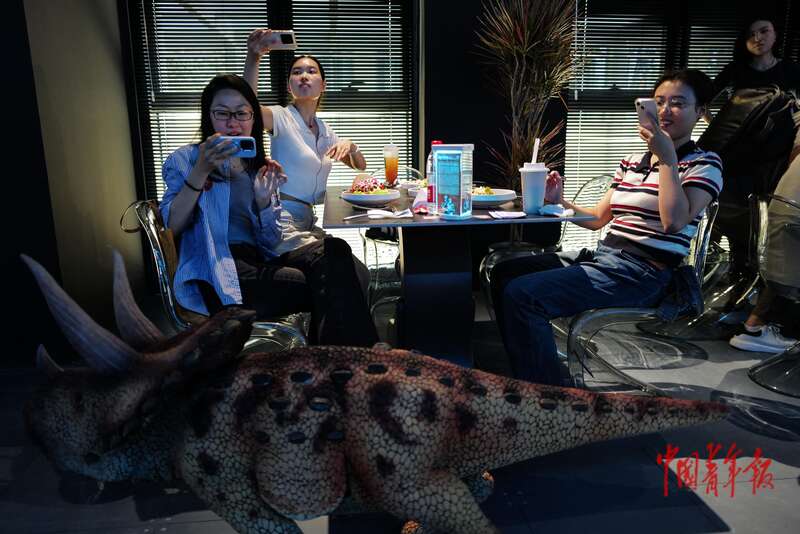 8月6日,北京经济技术开发区(北京亦庄)机器人产业园,智能机器人主题餐厅,几名女士在拍摄一只恐龙机器人。据介绍,餐厅目前共有20余个机器人,能为顾客提供丰富的“赛博体验”。“比如,等餐期间,市民可以和恐龙机器人、雕刻机器人等互动,还能体验煎饼机器人、咖啡机器人、奶茶机器人、烤串机器人等‘硅基大厨’的高超手艺。”中青报·中青网记者 赵迪/摄