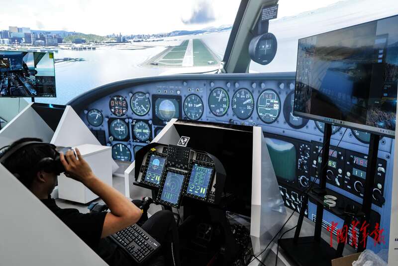8月6日,北京经济技术开发区(北京亦庄)机器人产业园,智能机器人主题餐厅体验区,一名男生在体验沉浸式飞行器。中青报·中青网记者 赵迪/摄