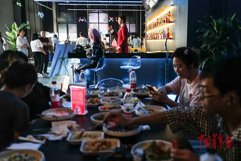 8月6日,北京经济技术开发区(北京亦庄)机器人产业园,智能机器人主题餐厅,几名年轻人在用餐,远处的仿生人形机器人酒保在迎客。据了解,这是一家以智能机器人为主题的餐厅,通过人机交互、智能迎宾、互动导览等系统,营造“舌尖+文化+科技”的全沉浸式用餐环境。该餐厅致力于成为机器人应用场景的示范平台,为未来更多机器人提供场景实验和数据抓取的机会。8月8日,2025世界机器人大会将在北京开幕,这里的全球首个机器人4S店也将正式对外开放。中青报·中青网记者 赵迪/摄