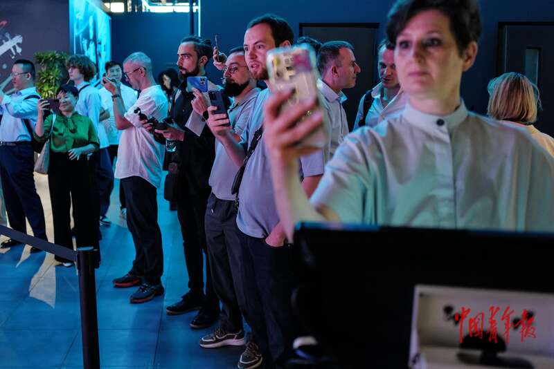 8月6日,北京经济技术开发区(北京亦庄)机器人产业园,智能机器人主题餐厅,来自国外的参观者在拍摄。中青报·中青网记者 赵迪/摄