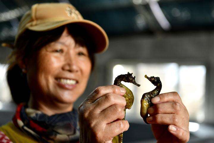 2025年7月4日,在山东省日照市东港区涛雒镇膨腹海马养殖基地,工作人员展示膨腹海马。涛雒镇是省级农业产业强镇。近年来该镇充分发挥临海资源优势,大力发展水产养殖、水产种业、水产品加工、海洋牧场等海洋经济,以产业兴旺赋能乡村振兴。