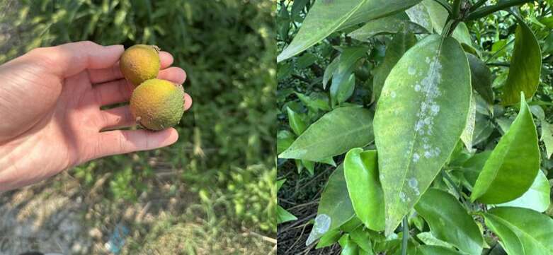 螨虫使柑橘叶片泛白、果实干瘪萎缩。受访团队供图