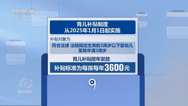 央视网消息(焦点访谈):日前,有一项关系千家万户的重大政策公布实施,那就是《育儿补贴制度实施方案》(以下简称《方案》)。根据《方案》,从2025年1月1日起,无论一孩、二孩、三孩,每年均可领取3600元补贴,直至年满3周岁。这是一项全国性的重要民生政策,面向育儿家庭全国范围全面直接发放现金补贴,有助于缓解家庭养育压力。哪些家庭可以申领育儿补贴?补贴标准为何如此设定?预期会达成什么样的效果呢?
