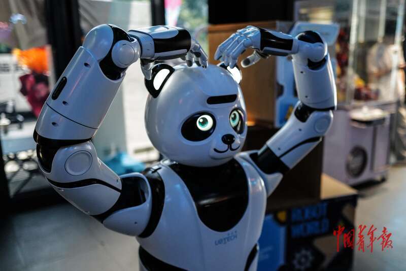 On August 6, at the Robot Industrial Park in Beijing Economic-Technological Development Area, several young people dine at a smart robot-themed restaurant. Equipped with human-robot interaction, intelligent greeting, and interactive guidance systems, the restaurant aims to serve as a demonstration platform for robotic applications, providing future robots with opportunities for scenario testing and data collection. In the photo, a panda-shaped robot forms a "heart" gesture with a customer.