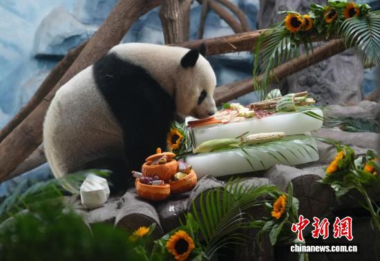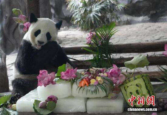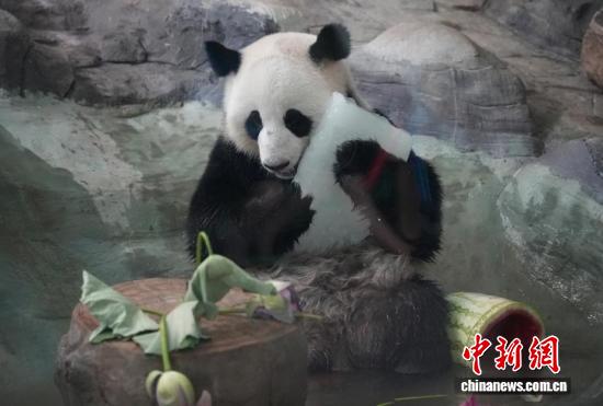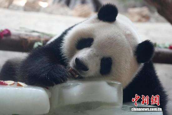 8月9日,重庆永川乐和乐都动物主题乐园为“青花”“青露”“爱莲”“巧月”四只大熊猫举办了一场集体生日会。图为大熊猫“青花”趴在冰砖上玩耍吸引参观者拍照。