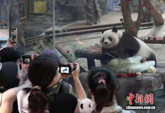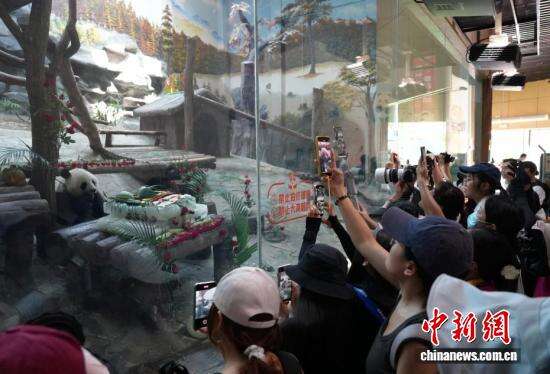 大熊猫“青花”吃生日宴吸引参观者拍照留念。