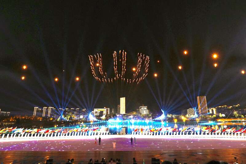 The grand opening performance featured traditional Chinese elements in four segments: Drums, Music, Poetry, and Flowers — showcasing the Golden Sun Bird, rap figurines, Twenty-Four Musicians, and the iconic Sichuan opera face-changing.