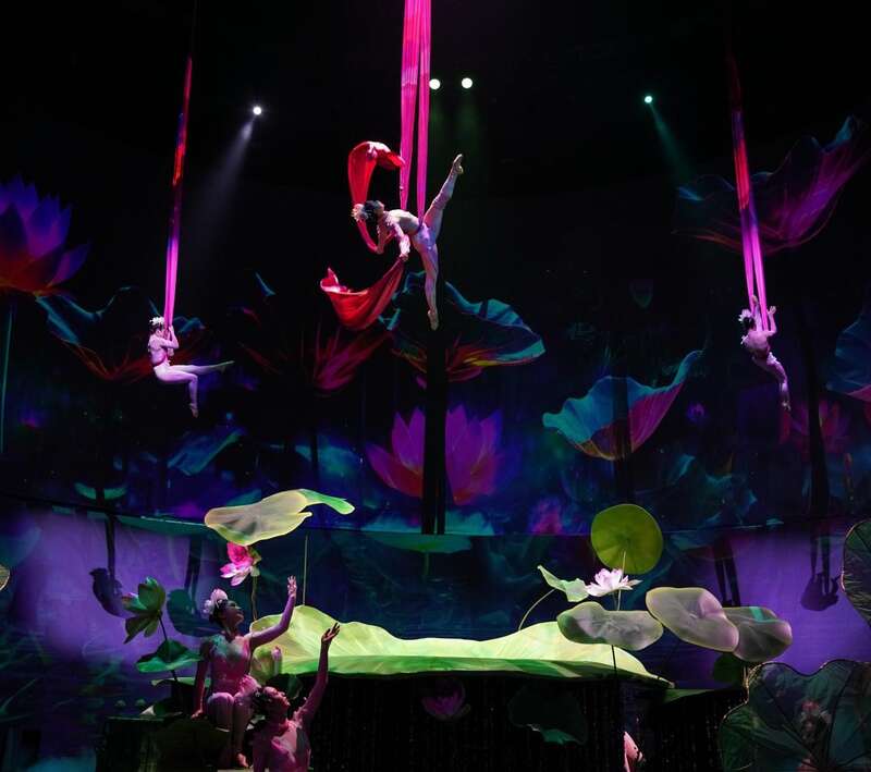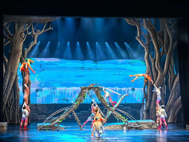 在舞台上,从地面到大屏都被光影环绕,打造全景呈现的动态沉浸空间,裸眼3D的视觉效果,将杂技高超的技巧表演烘托得更加惊险刺激。