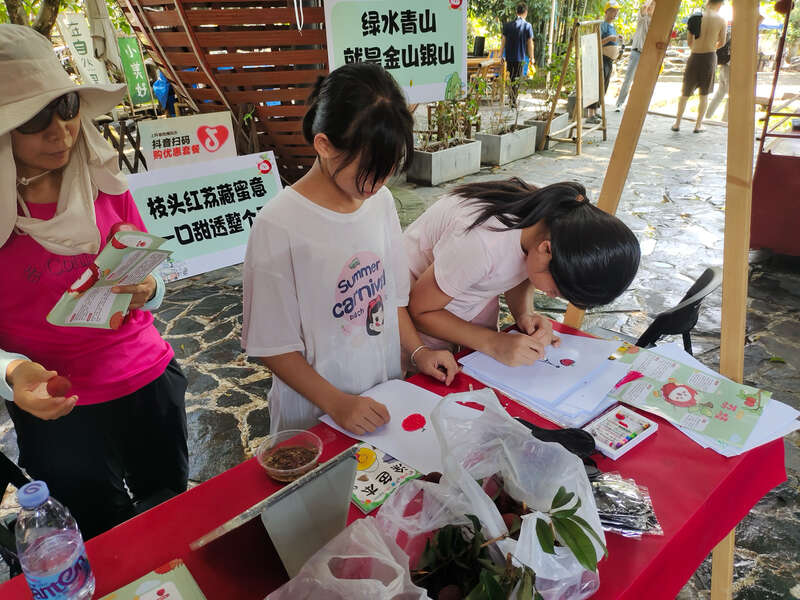 为了能让创意真正落地,团队在南平村架起摊位,开展了为期6天的公益推广活动。他们通过“捡垃圾换文创”环保公益活动,引导游客与村民共同参与景区环境治理;通过有趣的荔枝绘画、蒙眼识果和知识问答等环节,提升了南平农产品的品牌认知度。