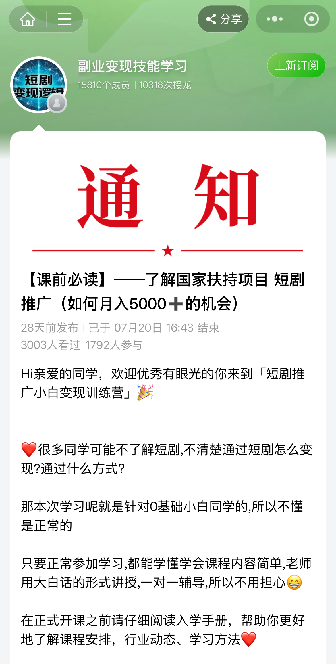 记者跟踪四个短剧推广培训群后发现,所谓“免费培训”纯属幌子。从第一节课开始,课程核心始终围绕开通短剧授权展开,对实操技巧却避而不谈。