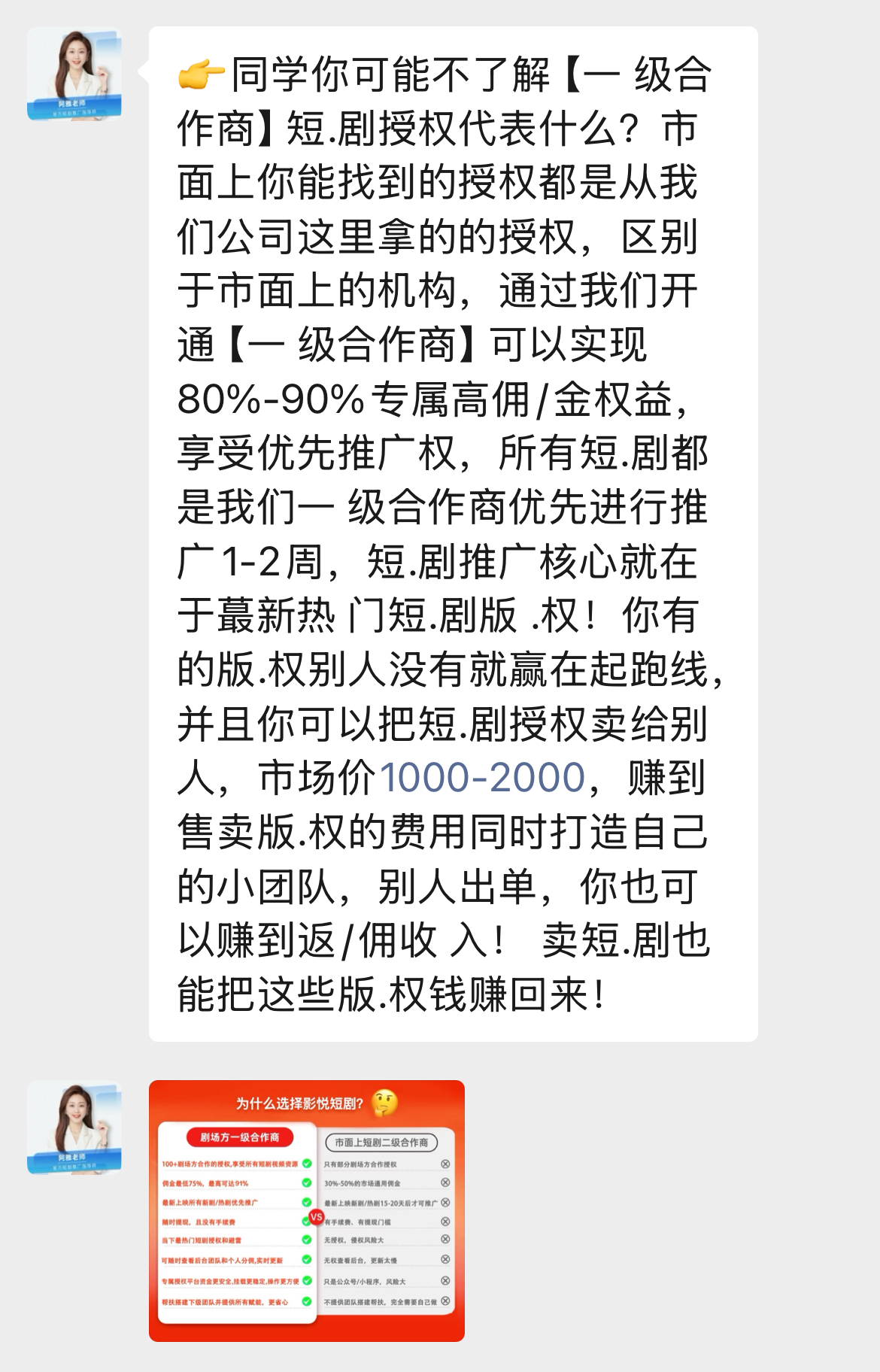 “市面上所有授权均源自我们,成为一级合作商可享80%至90%专属佣金。”培训群中,“阿雅导师”不断用收益截图刺激学员:“没经验没基础,只要你有短剧版权,都不是问题”“拿到授权后做短剧推广,每个月的收益高的大几万,低的也有五六千”“我这里刚毕业一个月的同学2天就爆了43000多元”。