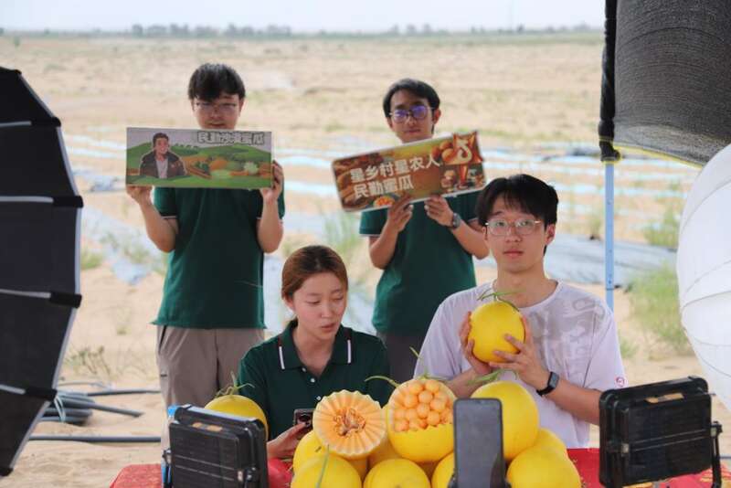 团队走访当地电商基地,针对农产品包装,结合沙棘、梭梭等荒漠植物元素创作系列IP形象及明信片;开展助农直播,推动“金红宝”甜瓜等特色农产品销售,促进交易近百单;全程跟拍纪实短片《一颗种子的旅程》,完整呈现蜜瓜从种植地到包装车间的全产业链条,为农产品溯源提供可视化模板。