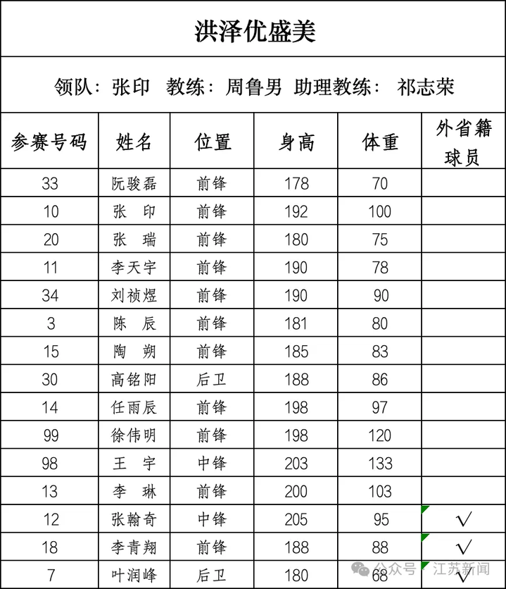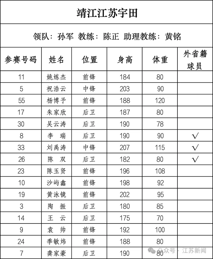 宜兴市队:平均年龄30岁,平均身高189.4cm。2023年八强。