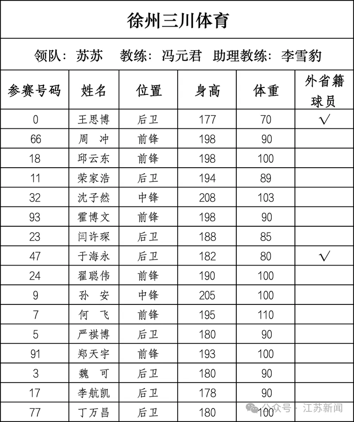 徐州三川体育:平均年龄31岁,平均身高190.3cm。
